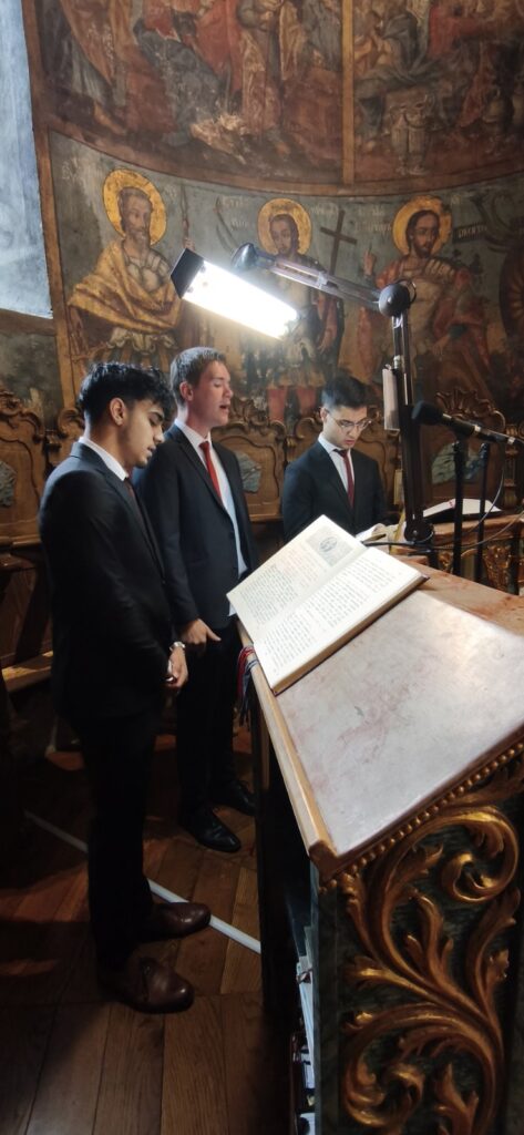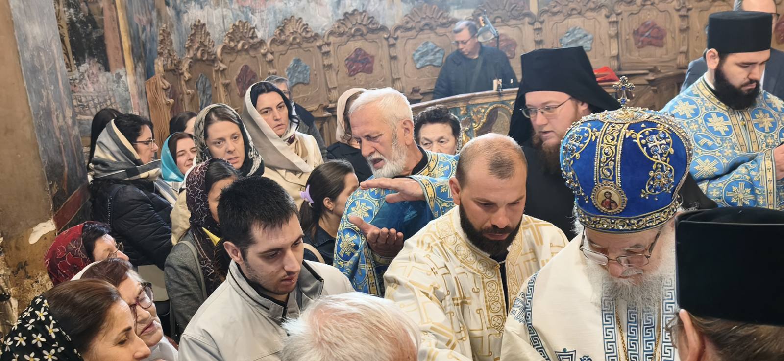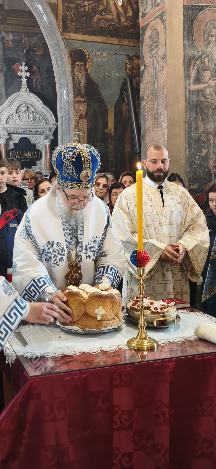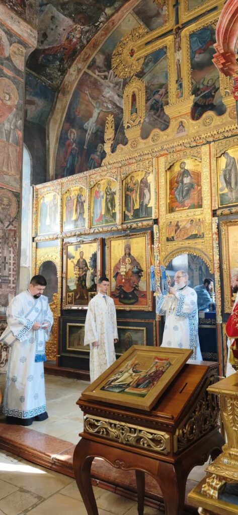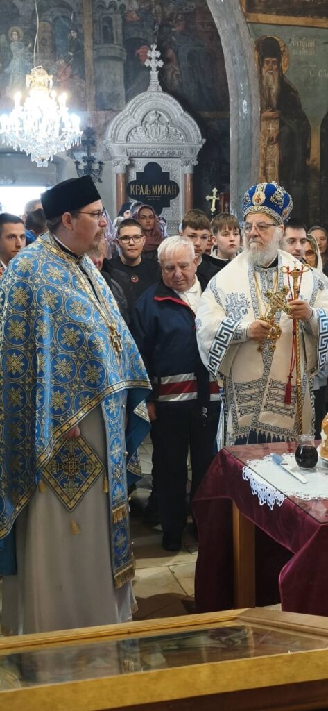 Након прочитаног јеванђелског одељка и Свете тајне причешћа приступило се освећењу славских дарова, које принесоше благочестиви кумови. У свом обраћању Митрополит Василије се захвалио домаћину, високопреподобном архимандриту Сави, игуману манастира Крушедол, као и братству ове светиње на гостопримству, а верницима упутио неколико реченица поуке уз објашњење значаја данашњег празника. Беседу Митрополита и појање Карловачких богослова можете послушати у прилогу.